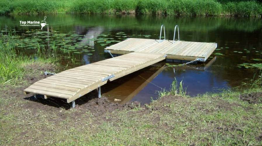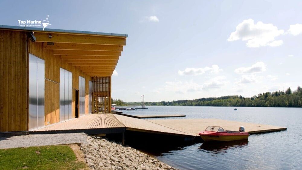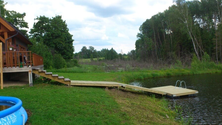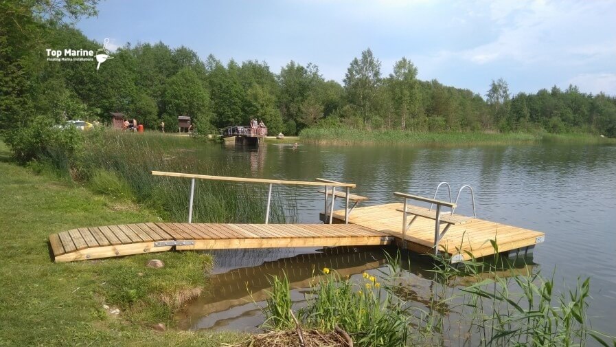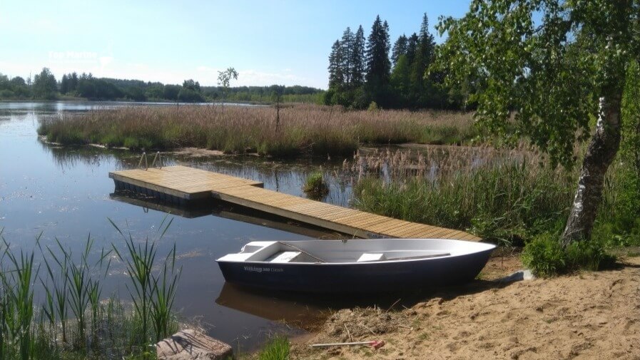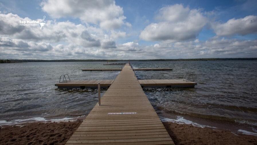 Puolassa sijaitseva uimalaituri rantaviivalla tarjoaa tilavan ja toimivan alustan niin uimiseen kuin veneen kiinnittämiseen.